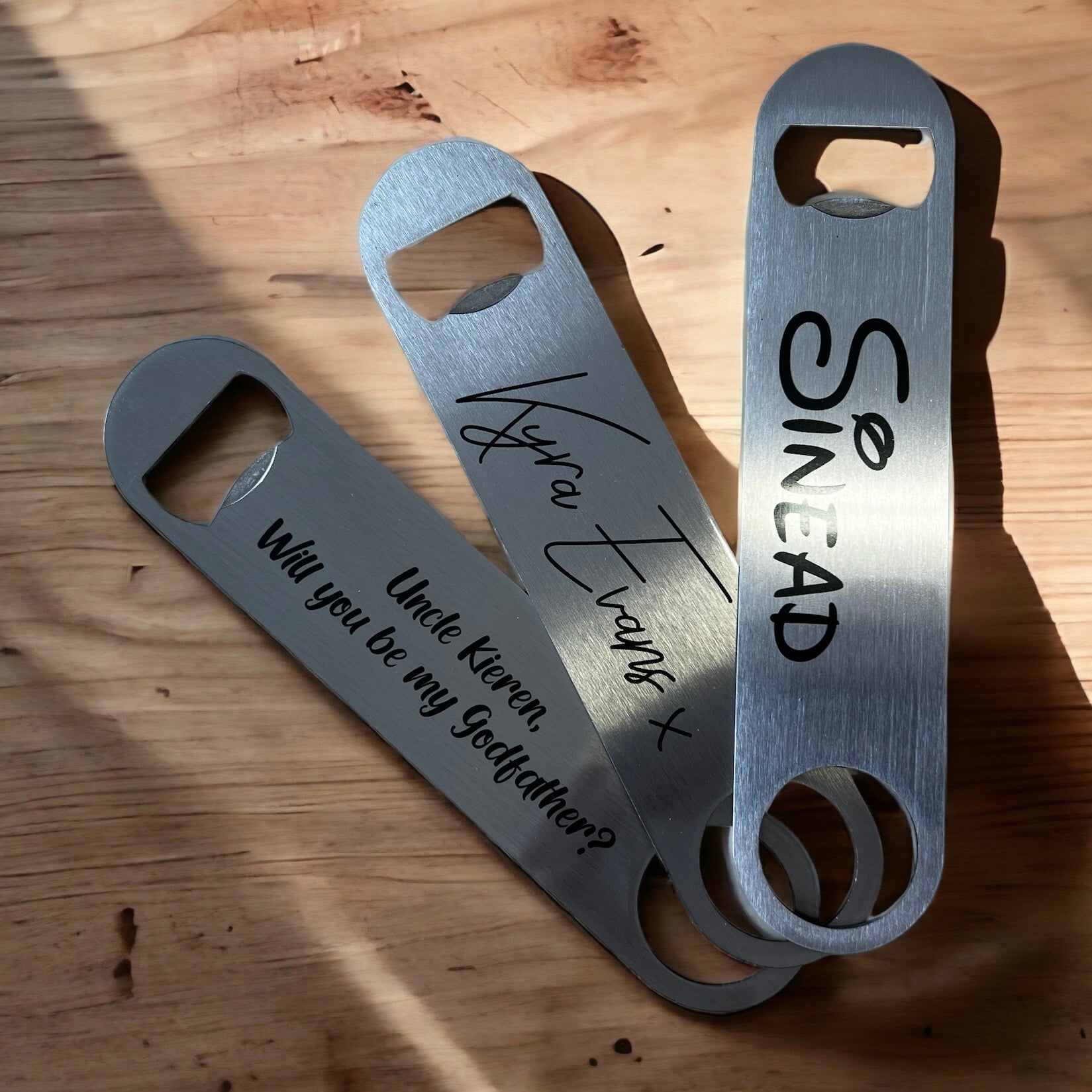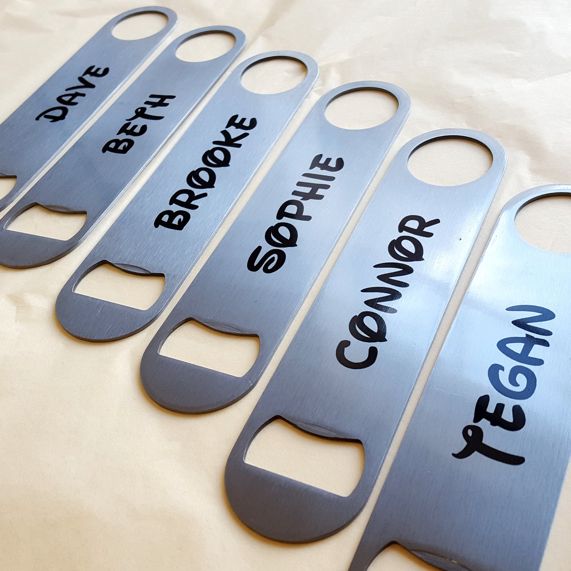 These hand-held flat bottle openers are made of stainless steel, making them durable enough to keep popping the tops off for years to come. This tool is easy to handle and precisely the right tool for the job. Each opening end is a different shape to accommodate various types of bottles. The handy size (7-inch length) makes this bottle opener difficult to lose. The personalisation makes this a unique, affordable, high-quality custom product for yourself or for someone else as a gift! All Text will be "Centered and Aligned" whether one line, two or three.
