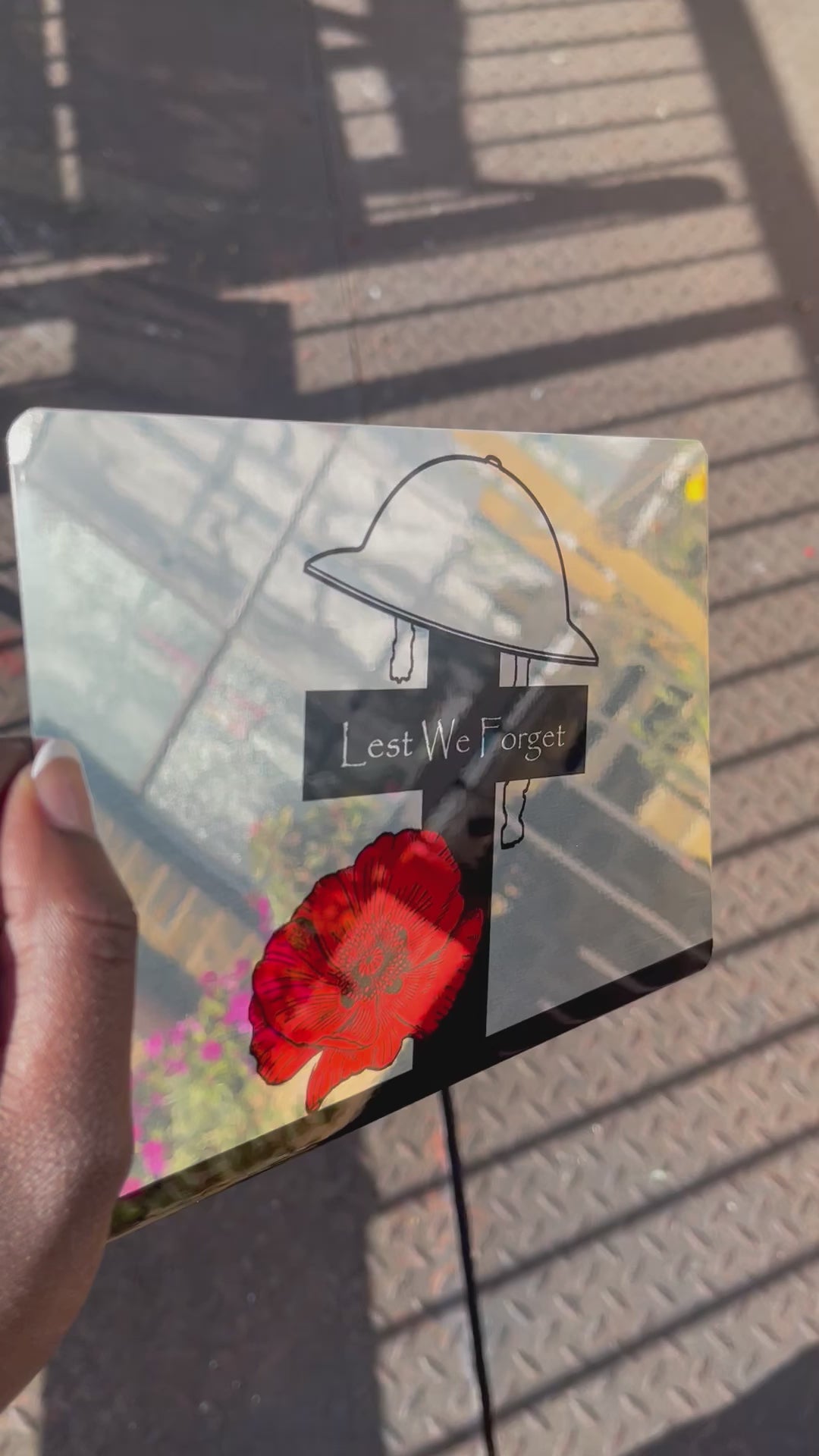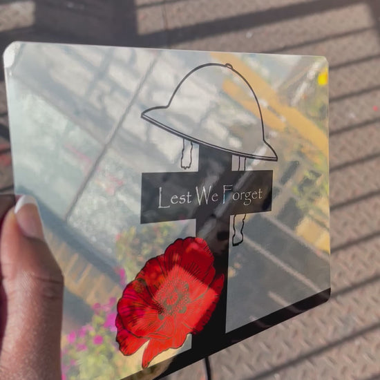 Cross & Helmet Lest we forget Military Poppy Metal Mirror Sign.