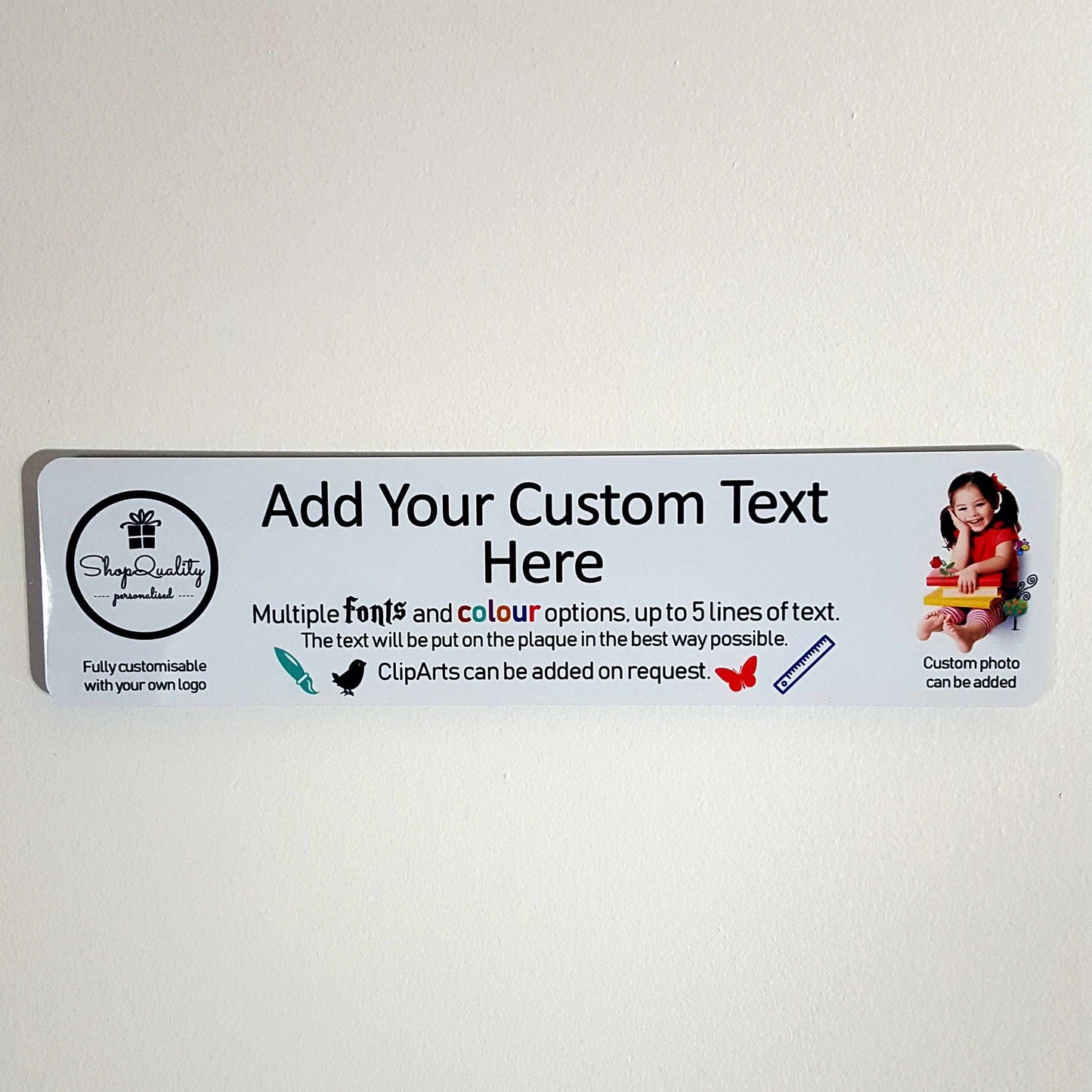 This Full Customisable Metal Door Plaque 20x5 cm (printed on white surface aluminium metal tinplate) is a perfect practical gift/ item that's well suited to almost any occasion! This sign can be personalised with Any Logo/ Any Picture/ Any Text. Made of 0.5mm mirror aluminium metal plaque. 7.8 x 2 inches, they would look great in any bedroom, bar, or office. These high-quality printed metal plaques come in a 20x5 cm size with sticky pads so you can fix them on the wall or door.