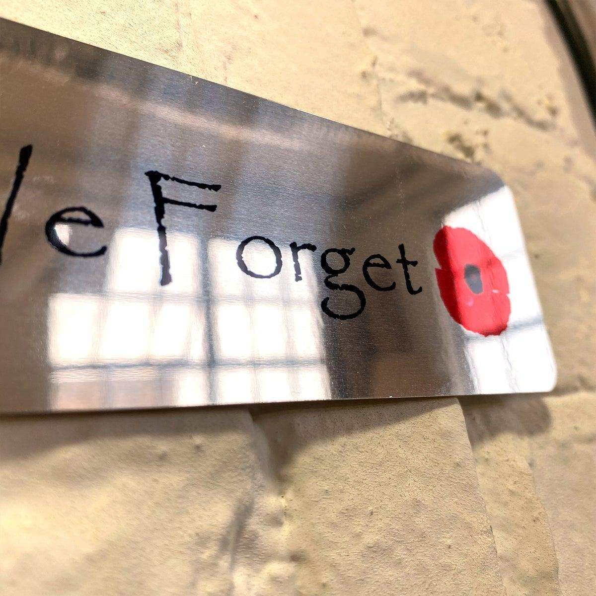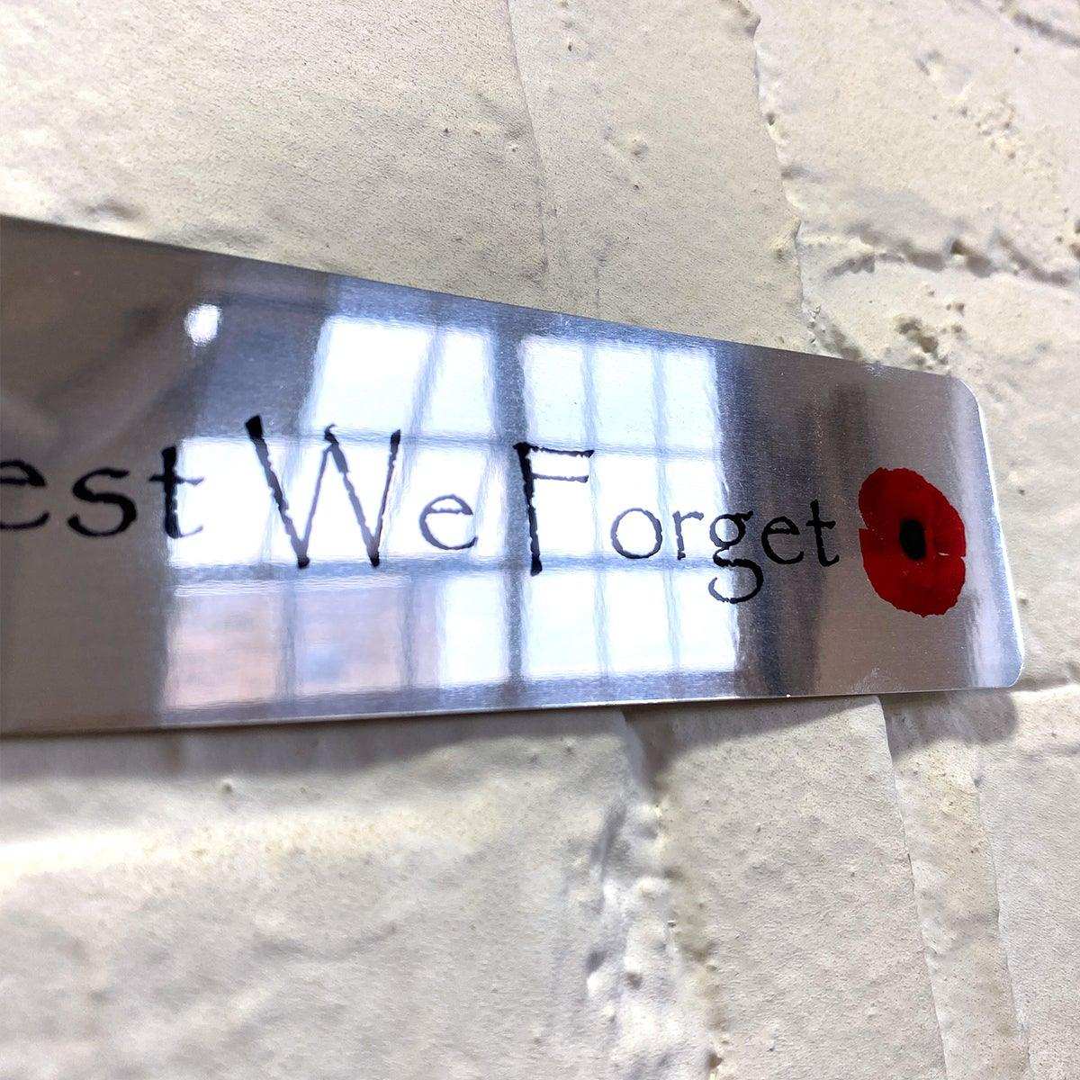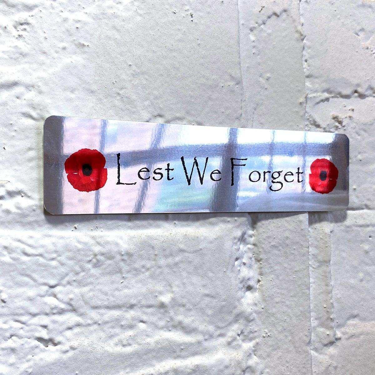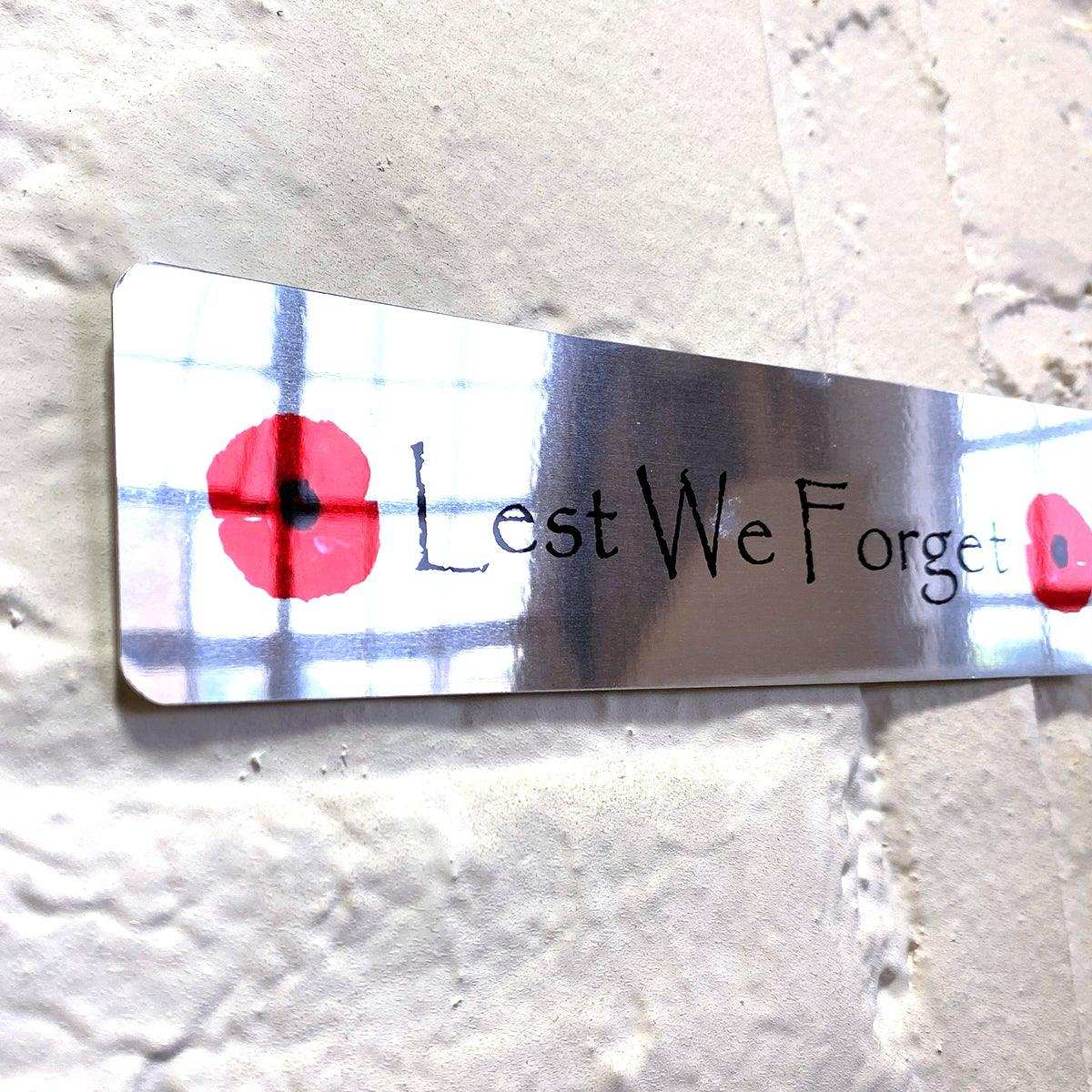 Printed Mirror Aluminium Metal sign 20cm x 5cm (200mm x 50mm) 7.8 x 2" Military Poppy Lest We Forget, glossy reflective surface.