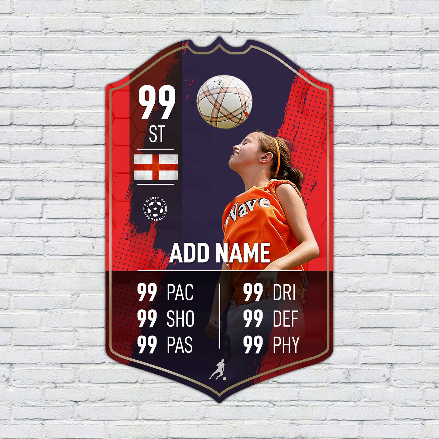 FULLY CUSTOMISABLE: with your Own Photo Player Name, Team & Nation, Position & Overall rating, Stats (Pace, Shooting, Passing, Dribbling, Defending, Physical).