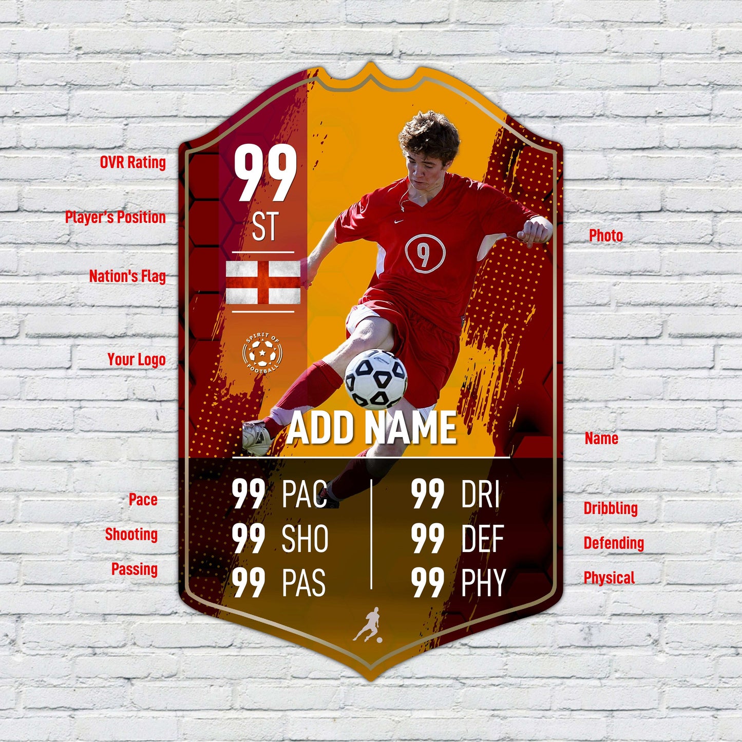 FULLY CUSTOMISABLE: with your Own Photo Player Name, Team & Nation, Position & Overall rating, Stats (Pace, Shooting, Passing, Dribbling, Defending, Physical).
