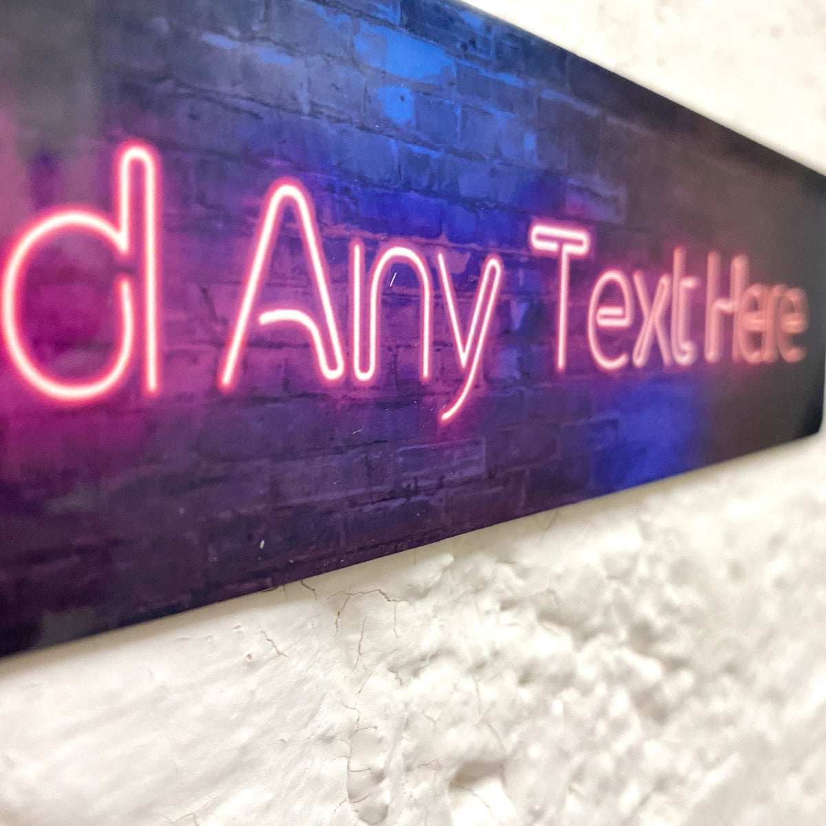 Printed Aluminium Metal sign 20cm x 5cm (200mm x 50mm) 7.8 x 2" Neon Text Effect, blue wall background design surface.Wall mounted with 2 sticky pads, this customised plaque would look great.Digital dye sublimation colour printing on a metal aluminium plaque 0.5mm.