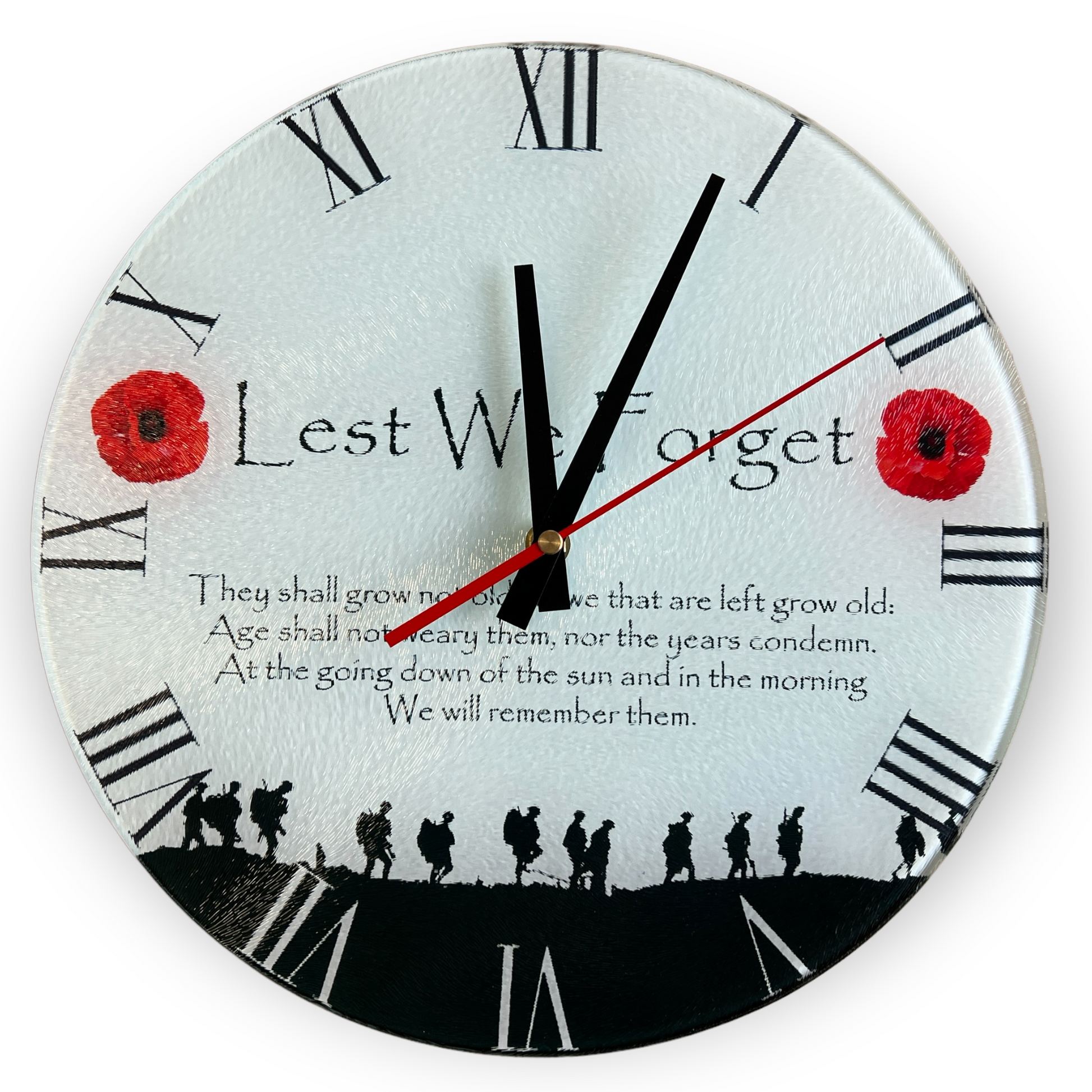 Premium Glass Round Wall Clock, Military Poppy themed Lest We Forget